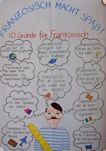 Schülerinnen des Französischkurses Q11 machten sich Gedanken, warum es sich lohnt, Französisch zu lernen. Hier das Plakat, das sie gemeinsam gestalteten: 10 Gründe für Französisch.