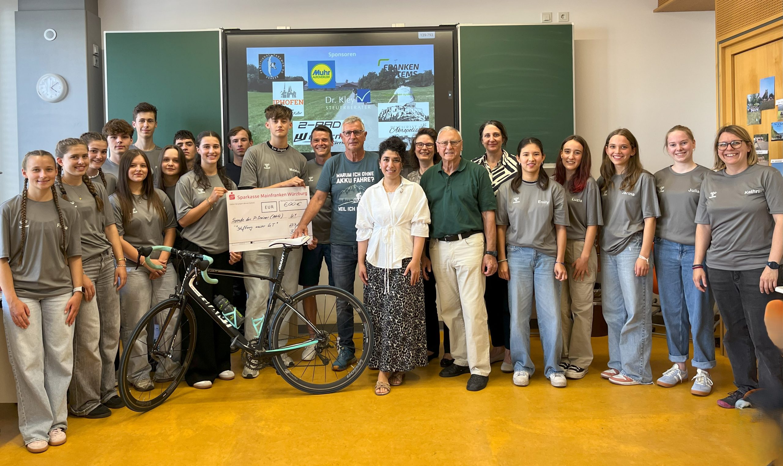 Im Rahmen des Schulfestes setzte das P-Seminar „Tour de Bayern“ den feierlichen Schlusspunkt unter ein ereignisreiches und engagiertes Projekt: Gemeinsam mit unserer Schulleiterin Frau Kurz übergaben die Schülerinnen und Schüler eine Spendensumme von 600,- Euro an die Stiftung „Unser Kitzingen“.