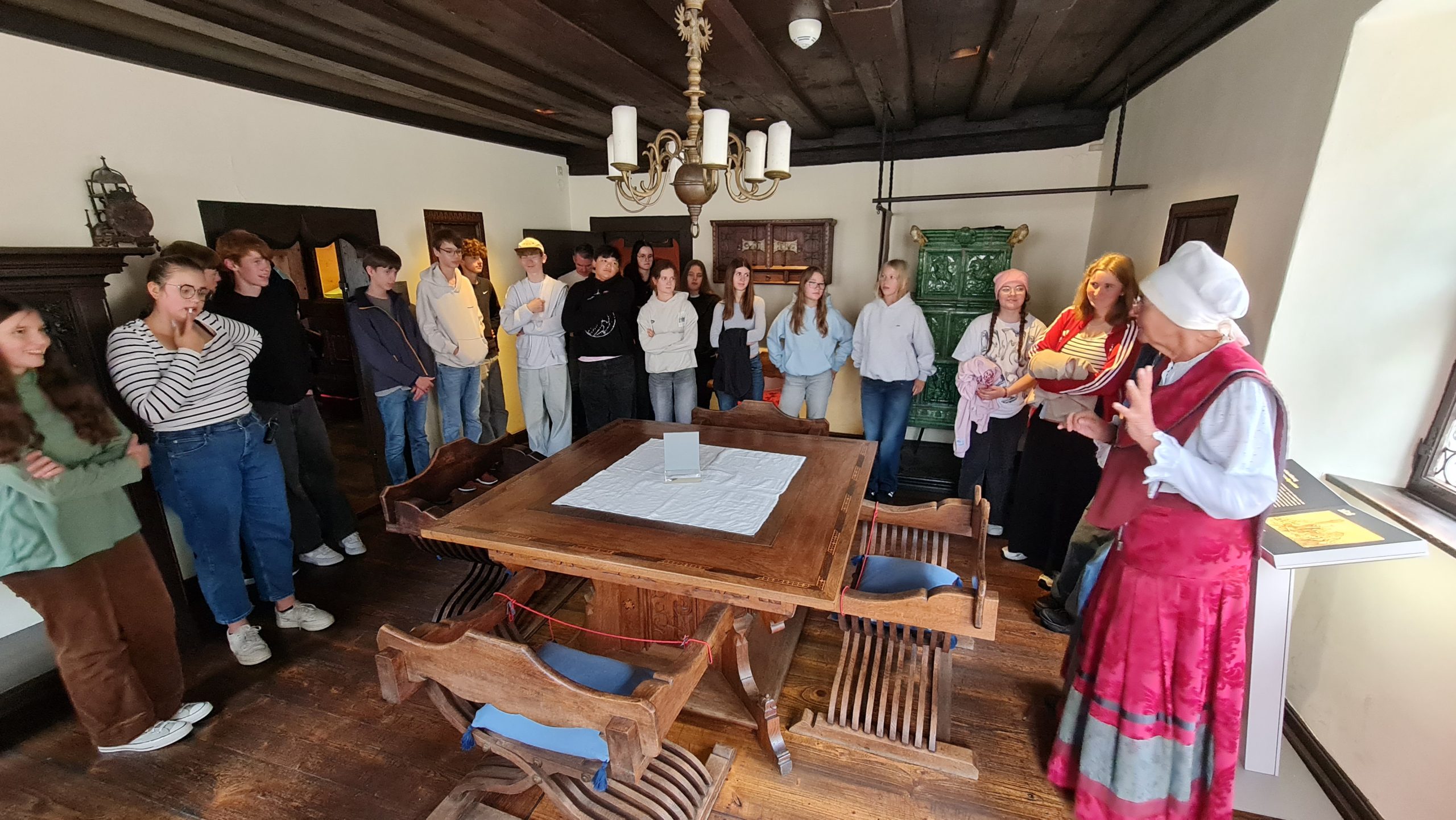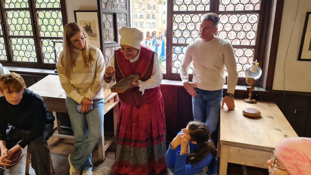 Beim abschließenden Besuch im Dürerhaus nahm Dürers Ehefrau „Agnes“, eine engagierte Schauspielerin in zeitgenössischem Gewandt, die Gruppe mit auf eine Reise ins Nürnberg des 16. Jahrhunderts. Das Atelier des Meisters faszinierte alle jungen Besucher.