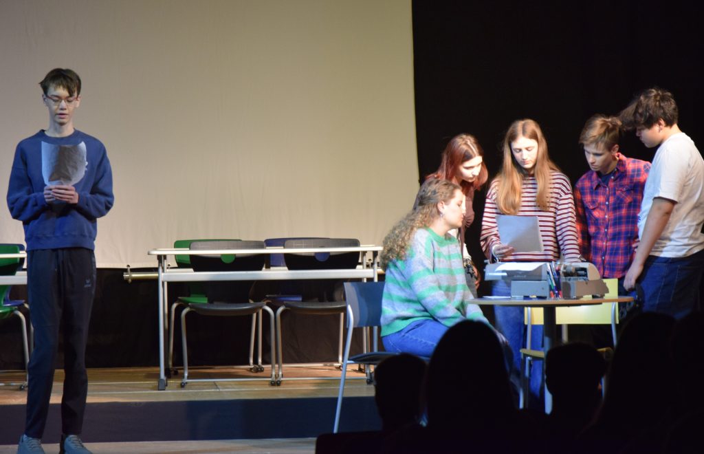 Seit dem Schuljahr 2020/21 gibt es am AKG die Möglichkeit, sich in der 8. und 9. Jahrgangsstufe für die Teilnahme an der Theaterklasse zu entscheiden. Nun sind die ersten Mitglieder einer Theaterklasse, die seitdem jährlich an Theaterproduktionen beteiligt waren, im Abiturjahrgang. An der Qualität des Schauspiels lässt sich bei Theresa Groß (Kommentar von links), Emma Käppner (Brian), Ronja Lehner (Brad), Jakob Pöllot (Direktor Owens) und Irene Sommella (David) ablesen, wie sehr der Besuch der Theaterklasse die jungen Menschen stärkt und wie intensiv ihre Präsenz, ihr Mut und ihre Selbstwahrnehmung durch das Theaterspielen gefördert werden. Für ihren weiteren Lebensweg wünschen wir ihnen alles Gute!